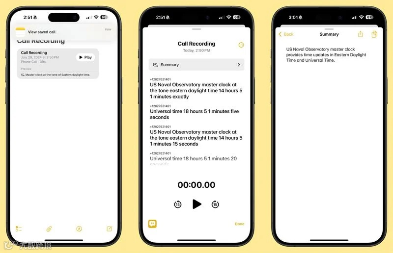 通话进行时,音频将被录制并保存到备忘录应用中。可以从备忘录打开录制的通话,您可以重新收听通话、查看完整的记录并从记录中获取摘要,而无需重新收听整个内容。