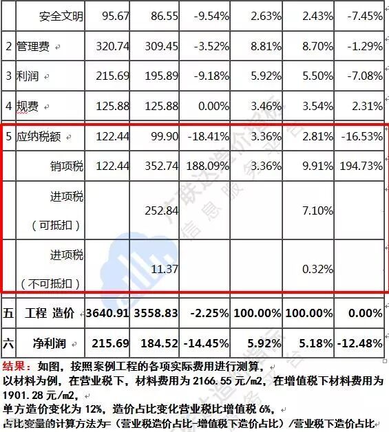 ②对应的材料、机械的占比也是营业税模式下82.03%占比高于增值税模式下的80.35%。
