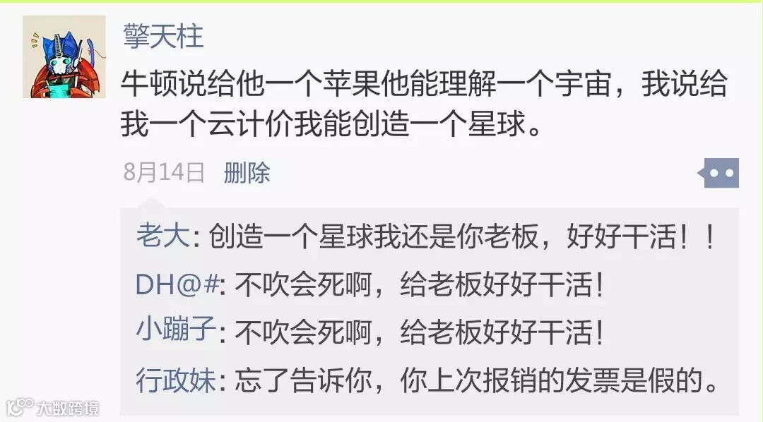 其实,擎天柱的表现还是很让人称赞的,在踏实努力默默耕耘的同时,也通过直接、间接等手法高调晒出了自己的进步。老板的眼睛是雪亮的,一步一个脚印踏实往前走,相信我,升职加薪走上人生巅峰那是早晚的事儿。