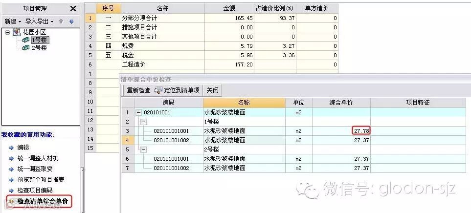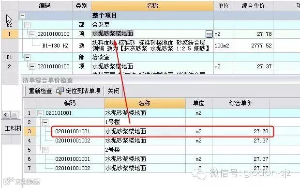 该功能可对整个项目进行检查,快速找到清单相同,综合单价不同的项目,并且可以定位到错误清单进行修改