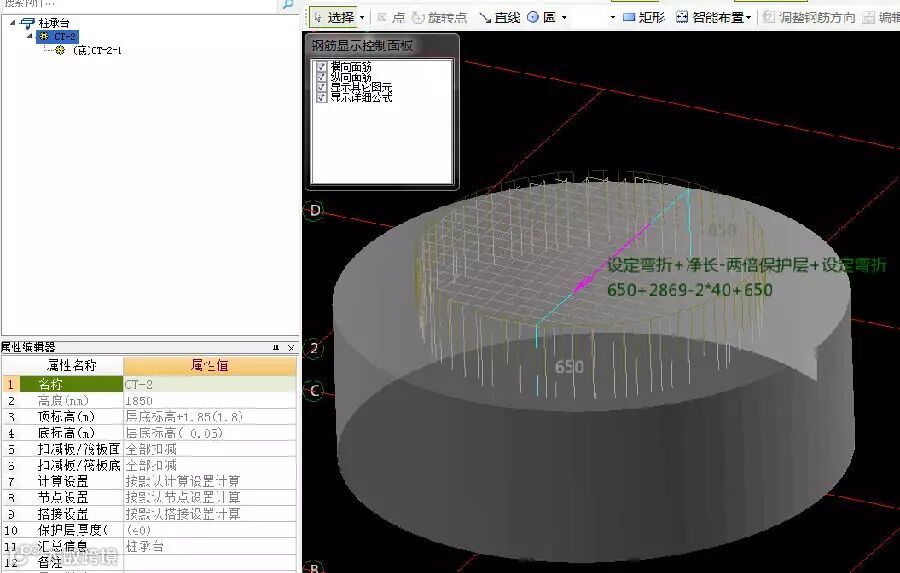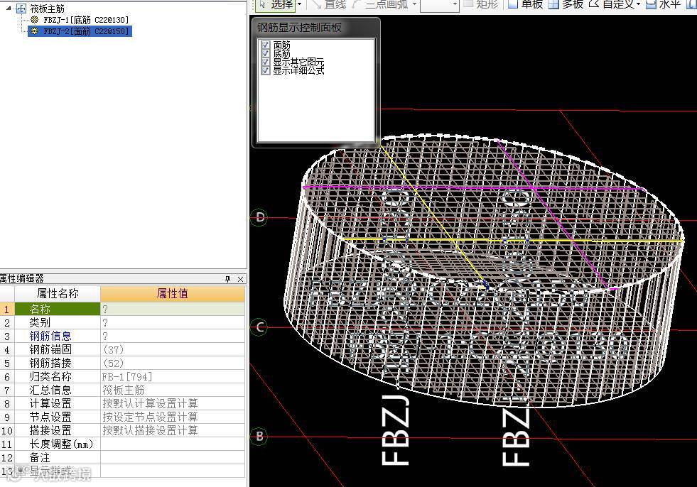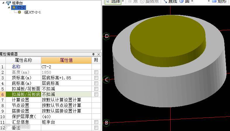 从剖面图可以看出,下面的园内底筋是Φ22@130双向,面筋是Φ22@150双向,上面的园内没有底筋,只有面筋Φ12@150双向。插入下面的园内指定长度650,在2013桩承台的参数图元里,唯独没有圆柱形的桩承台,但是可以定义自定义桩承台,我用自定义桩承台功能,我根据承台的配筋形式采用两个图元类别进行组合处理了此问题。下面都有圆形筏板,上面定义自定义桩承台,利用了桩承台和筏板的构件关系变相的进行了构件定义。计算结果完全符合设计图纸的要求。为扩大交流,本人将处理步骤在此进行分享,希望对用户遇到此类问题有所帮助,也希望有其他处理技巧的朋友参与分享和交流。更欢迎广大用户对分享过程有异议的提出宝贵建议;