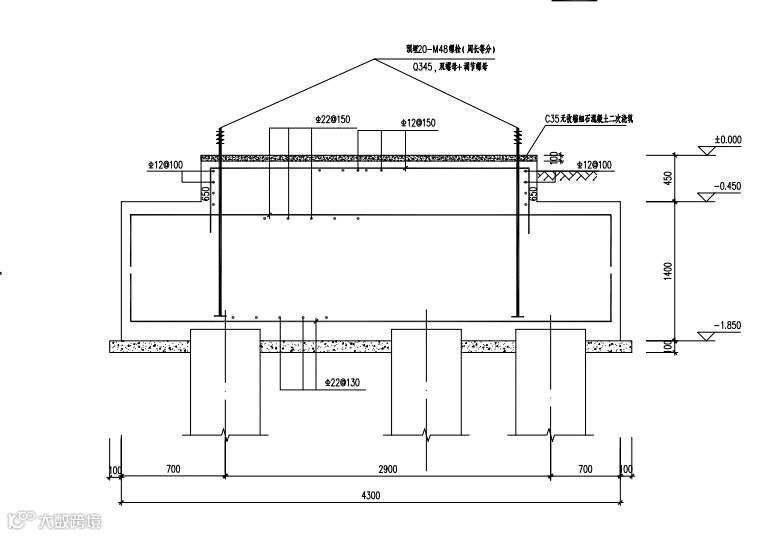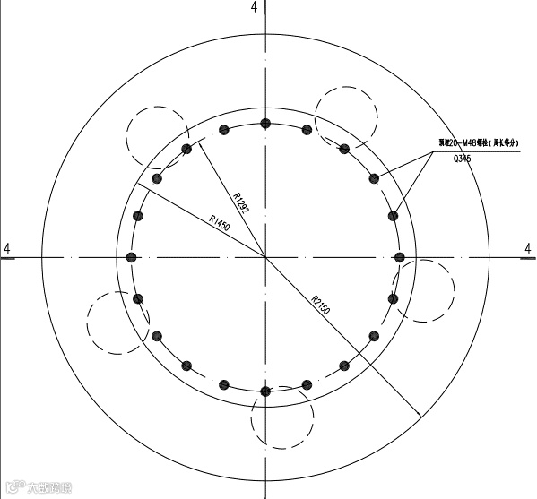下图时下面半径2150,厚度为1400,上面是半径为1450,厚度为450的踏步式圆形桩承台,承台内除了配筋以外,还预埋20根直径48的螺栓
