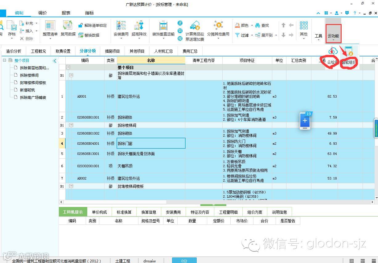 三、然后在说下GCCP5.0云计价的智能组价功能,投标导入清单后,可以直接使用“云功能”下面的“智能组价”快速进行组价,提高投标效率。目前智能组价的数据来源主要有行业大数据(广联达提供的数据库)和自积累数据。当没有自积累数据库的时候或者新人不熟悉定额的时候,可以采用行业大数据进行组价。如果有自己积累的组价数据,最好还是采用自积累数据,这样组价更靠谱。总之,智能组价让造价工作变得更高效,更简单。