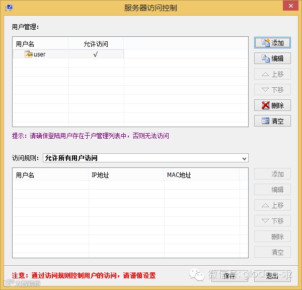 打开访问控制后如下图所示。这个界面提供了两种控制方法,上半部分即通过账号的方式进行权限控制;下半部分是通过IP地址和Mac地址进行权限控制,可以忽略。