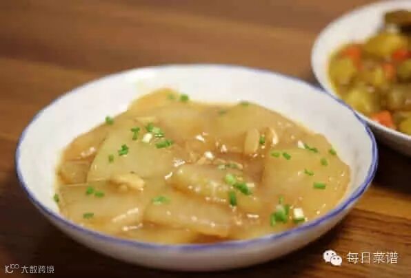 2. 冬瓜软后,快要收汁时加些水淀粉,上碟,撒上葱花。
