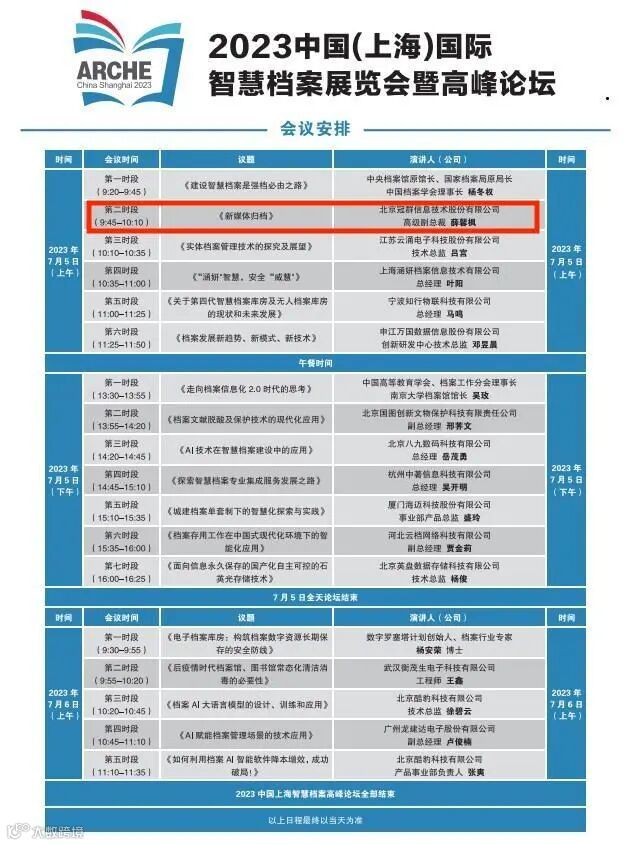 2023年7月5至7日,为进一步推动档案行业交流互动,强化档案行业的合作意识、创新意识,实现相互促进、共同发展,“2023中国(上海)国际智慧档案展览会暨高峰论坛(ARCHE-2023)”将在上海新国际博览中心召开。北京冠群信息技术股份有限公司高级副总裁薛馨枫、企划发展部总经理高婉玉和生态发展经理常贺共同出席会议。