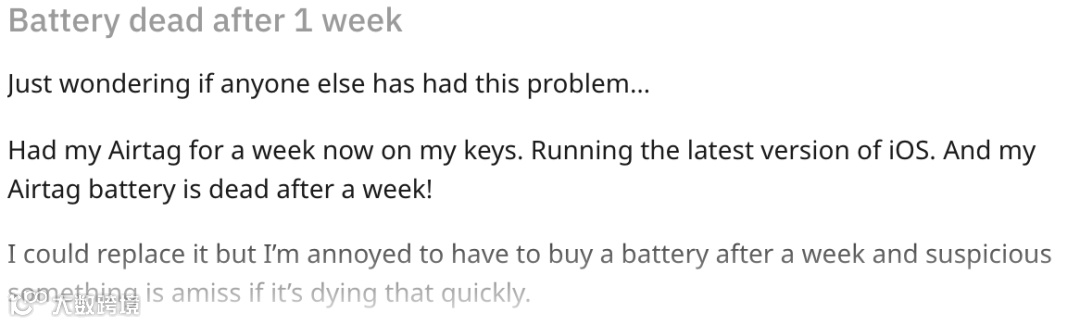 更惨的一个哥们才用了一周,就显示没电了。后来换了电池后还是没电,所以直接换了个新的 AirTag。
