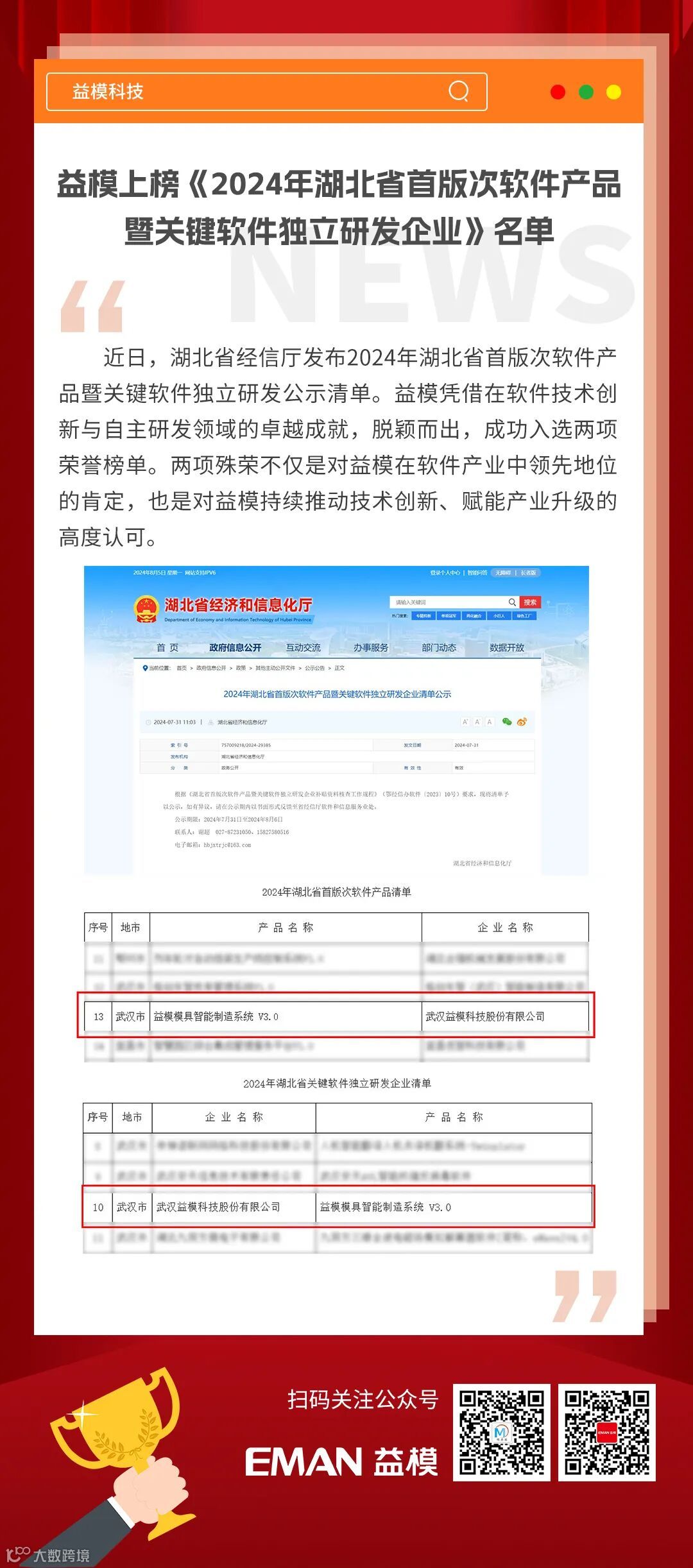 益模模具智能制造系统入选湖北省首版次软件产品,益模也被评为关键软件独立研发企业,展示了在关键软件领域的深厚积累与技术创新能力。作为湖北省软件产业创新发展的重要标杆,益模董事长兼总经理易平作为“湖北造”软件企业家代表登上湖北卫视。