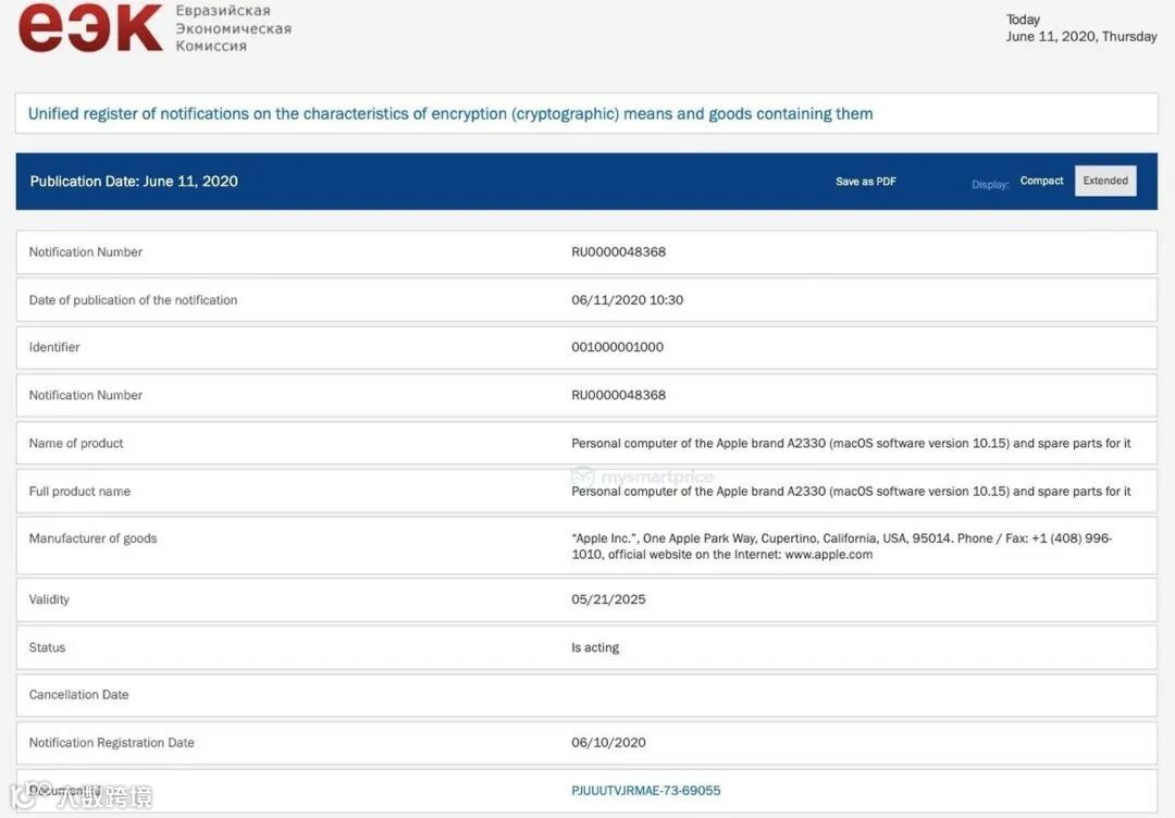 除了新的 iPhone 文件外,苹果还注册了一个以前未见过的 Mac 型号,其标识符为 A2330,并运行 macOS 10.15 Catalina。