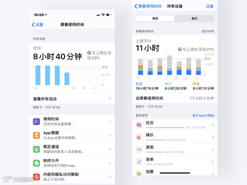 「屏幕使用时间」是 Apple 在 iOS 12 中引入的新功能,能够为苹果设备使用者提供一目了然的设备使用时间数据,同时对设备使用时间进行管理和限制。