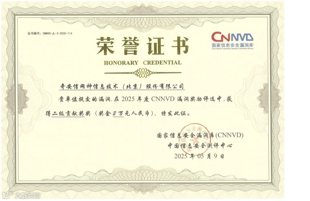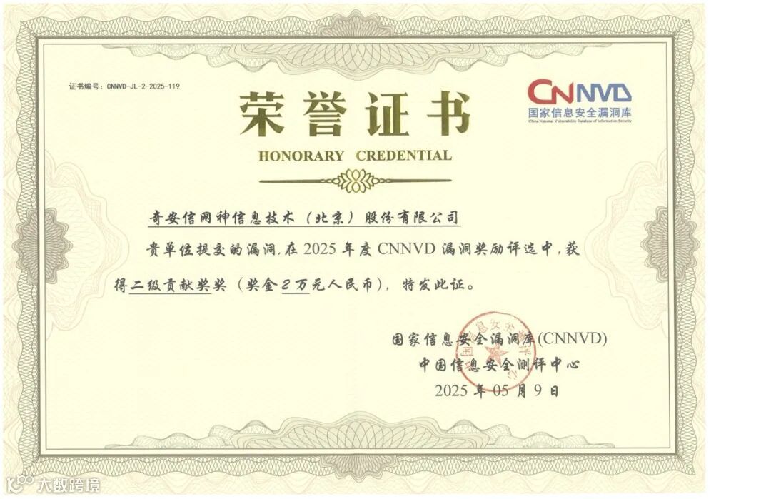 国家信息安全漏洞库(CNNVD)于2009年10月18日正式成立,是中国信息安全测评中心为切实履行漏洞分析和风险评估的职能,负责建设运维的国家信息安全漏洞库,面向国家、行业和公众提供灵活多样的信息安全数据服务,为我国信息安全保障提供基础服务。