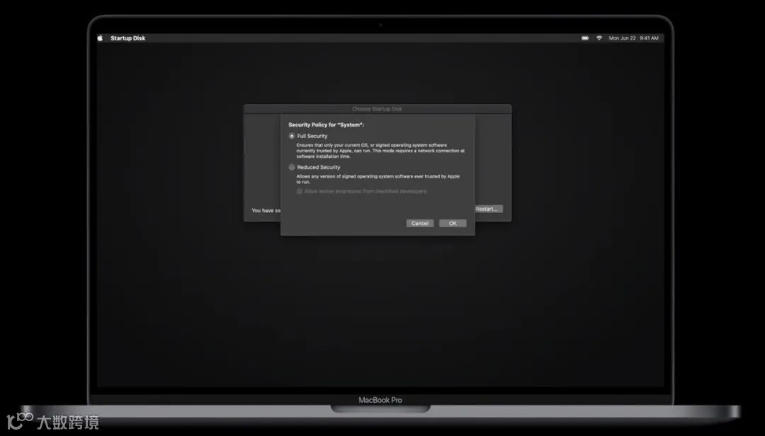 此外,启动磁盘是一项新功能,使用户可以为启动卷选择不同的安全模式。默认情况下启用的完全安全性提供与 iOS 设备相同的最佳安全性,并允许用户从外部磁盘启动而不降低系统的安全性。