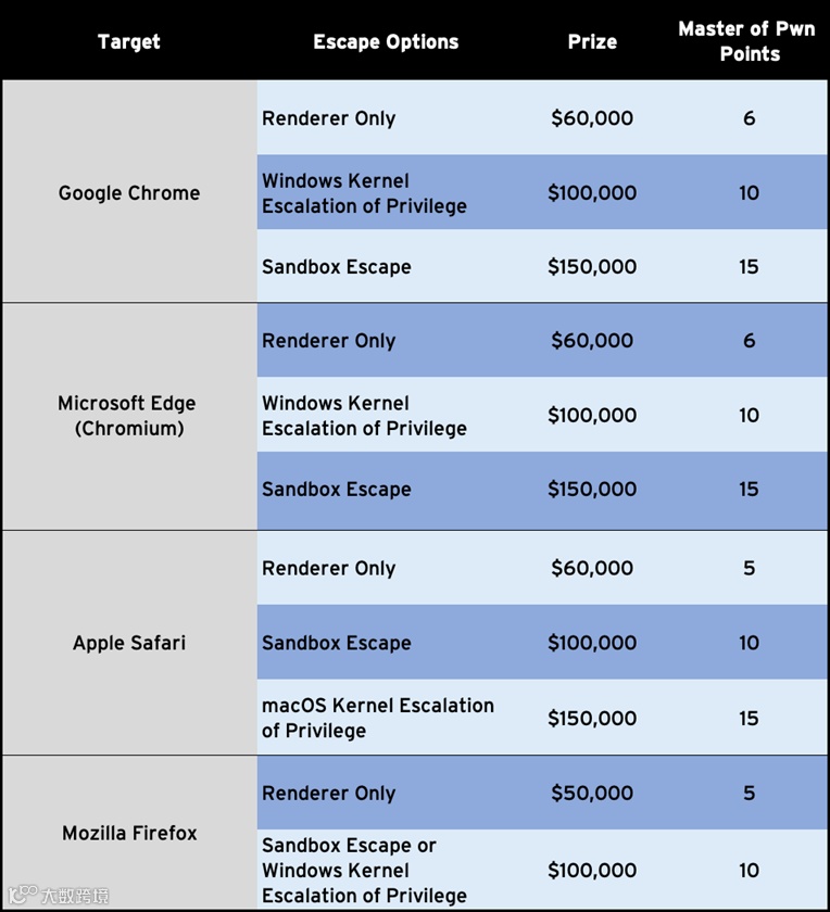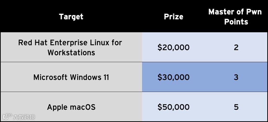 该类别也存在附加赏金。如果选手能够逃逸guest OS,则通过Windows 内核中的一个漏洞(除 VMware ESXi之外)在主机OS上实现提权,可获得额外5万美元的赏金和5个积分点的奖励,因此选手最多可在Hyper-V目标上获得30万美元的赏金。