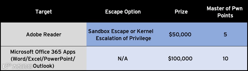对企业应用类别的利用尝试必须源自正在进行测试的目标处。比如,禁止从命令行启动测试目标。该类别的奖金从5万美元(通过沙箱逃逸或内核提权实现Reader 利用)到10万美元(Office 365应用)不等。Word、Excel和PowerPoint 都是有效目标。基于微软Office的目标会启用受保护试图。Adobe Reader 将在适用情况下启用受保护模式。