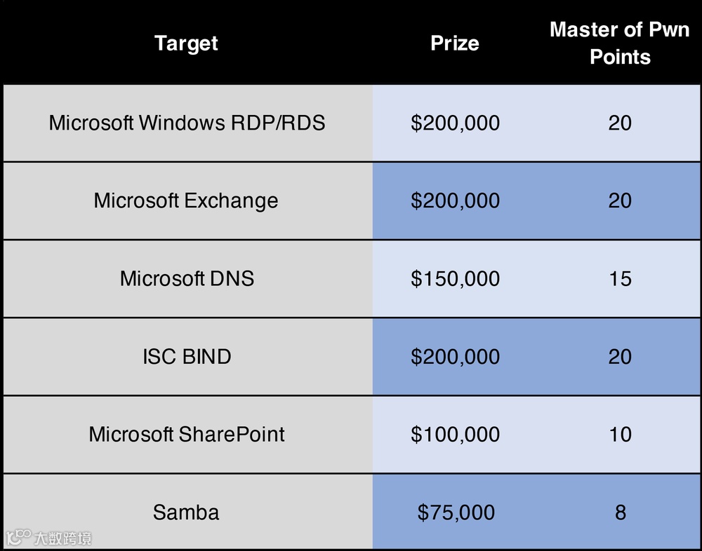 本次大赛在服务器类中增加了ISC BIND和微软DNS Server。如能够在这两个目标上实现成功利用,则可分别获得20万或15万美元的奖励。去年曾将Samba增加到该类别但并没有选手选择。微软Windows RDP/RDS提供的奖励最多为20万美元。