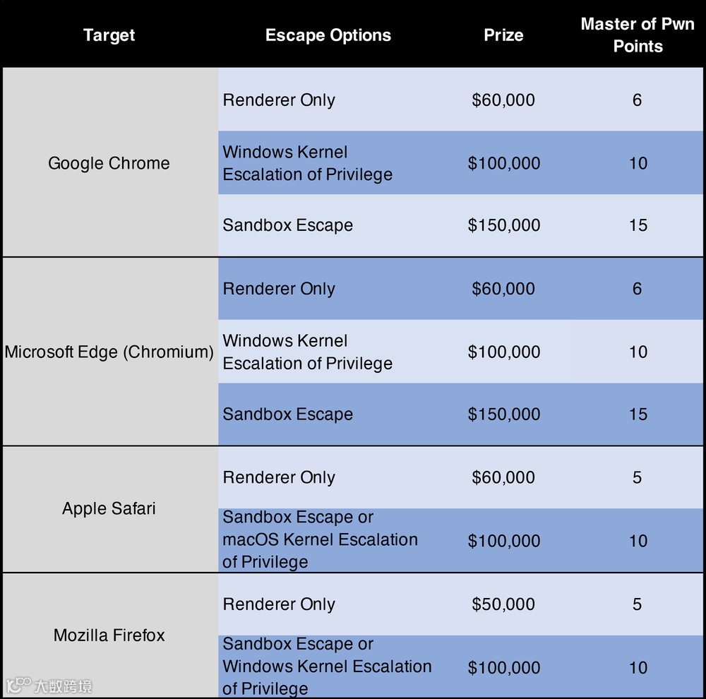赞助商VMware 这次提供的目标是VMware ESXi 和 VMware Workstation,奖金分别为15万美元和8万美元。微软也回归,将为成功的Hyper-V客户端guest-to-host提权提供25万美元的奖励,是虚拟机类的最高奖金额。OracleBox 本次提供4万美元的奖励。