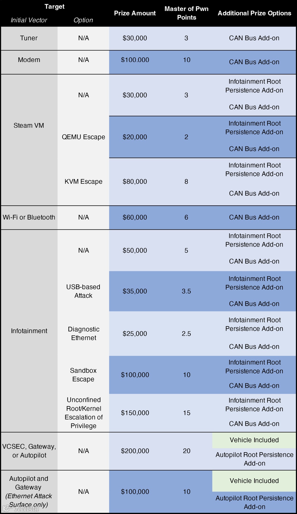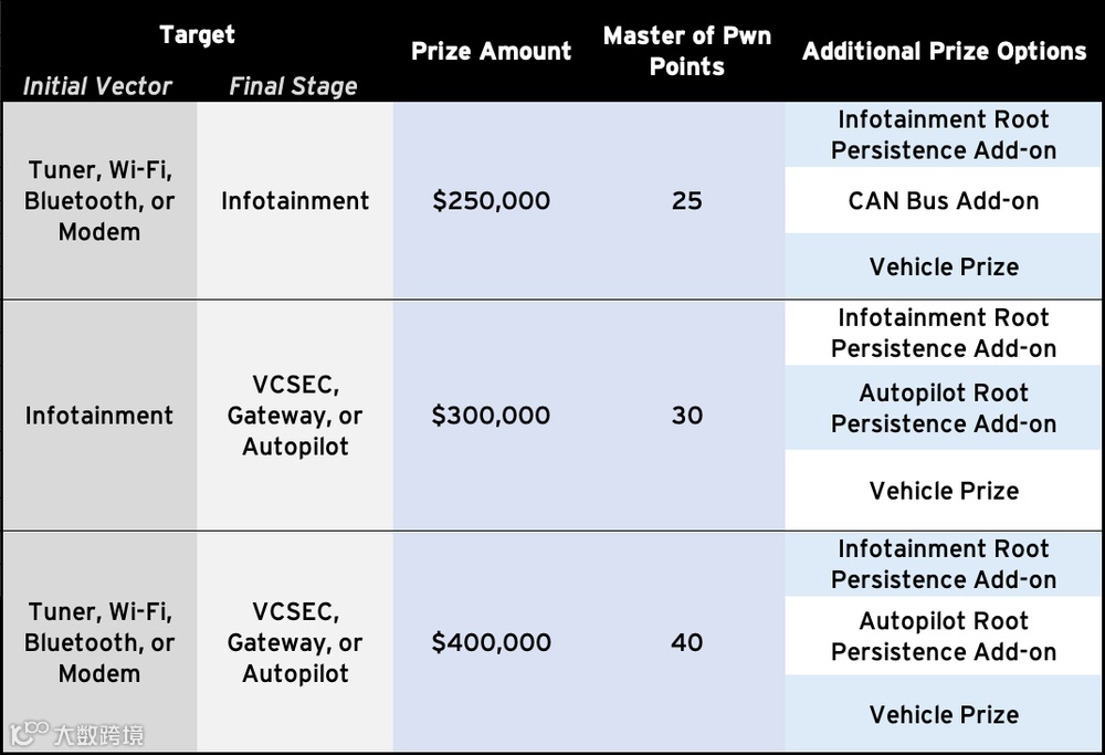 除了汽车本身和50万奖励外,选手还可获得额外奖励,获得60万的总奖励。这是Pwn2Own 历史上的单个最高奖励目标。如果有人达成这一目标,则意味着获得60个积分点,从而获得几乎不可超越的地位。多个不同级别包括不同的外奖励类型和奖励金。