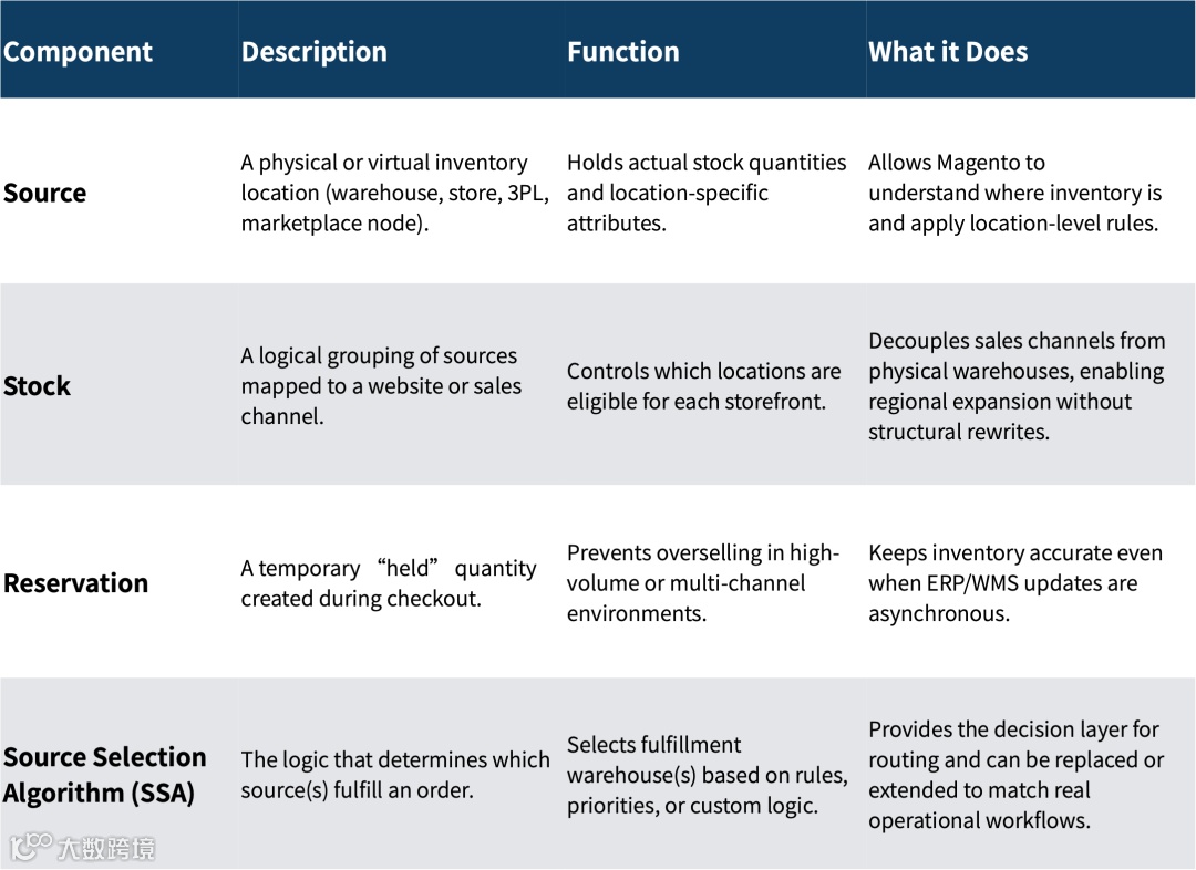 Magento原生内置多仓库库存框架(Magento Inventory Project,前称Multi-Source Inventory),为真实履约场景提供结构化分配模型。其架构确保路由规则处于干净、独立的逻辑层,演进过程不影响系统稳定性。 该设计同样支撑Magento库存管理API,为无头 storefront、中间件及ERP/WMS集成提供标准化接口。核心组件如下: