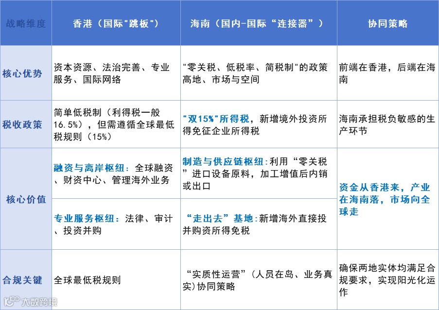 对深耕海内外市场的企业而言,最优解从来不是“选海南还是选香港”,而是“让海南和香港各司其职”,构建“香港赋能+海南落地”的协同体系。具体可落地三个方向: