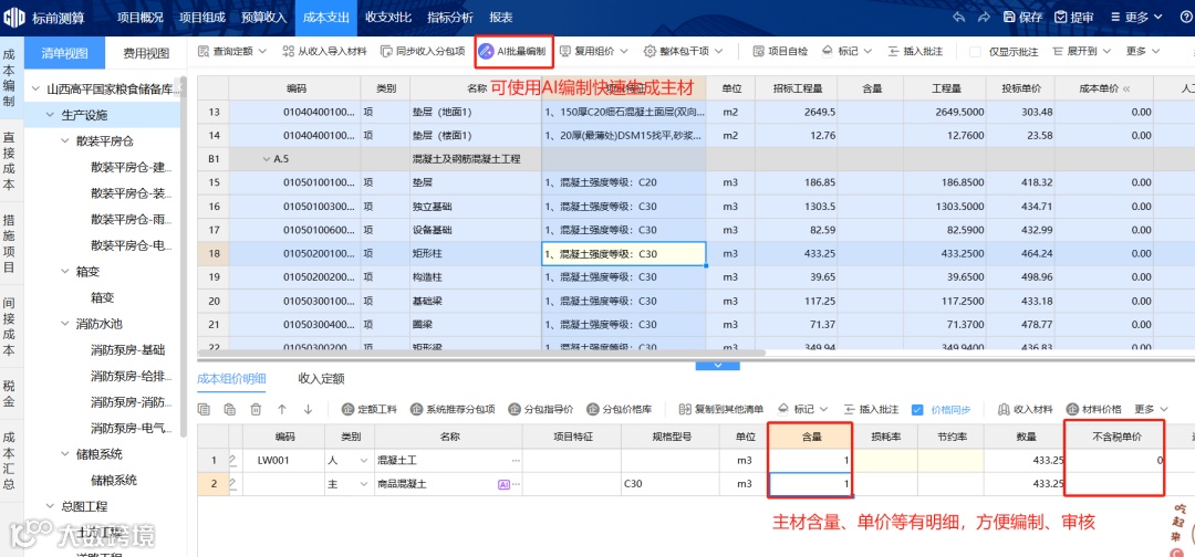 1、可通过相同清单合并编制、复用到其他清单、AI按照项目特征生成主材等功能,快速完成多个单体、多条清单的人工费、主材费成本列项,大幅减少重复性工作,提高工作效率。二队王景春使用AI生成主材的功能,顺利在半天时间内完成了山西医科大学中都校区学生公寓投标项目的主材列项。