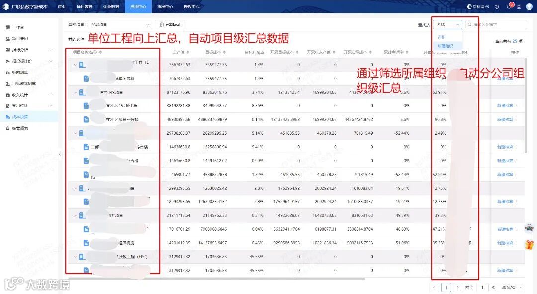 通过成本核算台账看板实现:单位工程智能关联所属分公司。自动生成项目级汇总数据、分公司经营数据报表、双维度(项目+组织)一键分析。