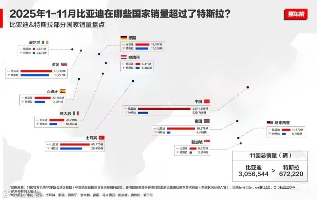 这是一种典型的“现实优先”出海路径:不急于被理解,先确保能被使用。比亚迪2025年1—11月累计出口87.8万台,同比增长144%,较2024全年总出口量已实现翻倍式增长,比亚迪已经成为中国出口增速最快的车企之一。
