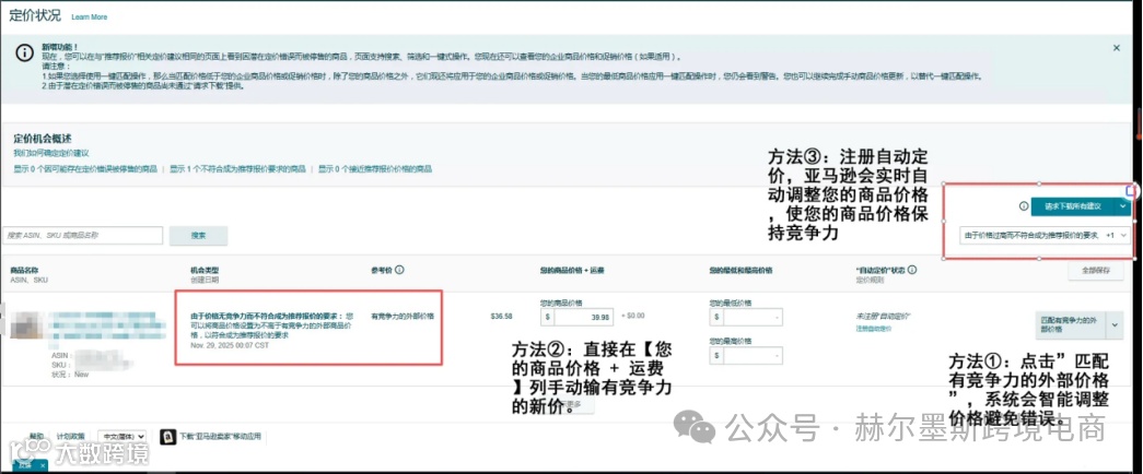 直接在后台找到“匹配有竞争力的外部价格”选项,点击之后系统会自动帮你调整到合适的价格。 这是最省心的操作。