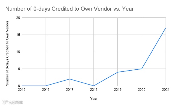 另外在自家产品中检测在野 0day 的厂商数量也在增多。厂商似乎在2021年找到了更加成功的检测方法。比如谷歌在自家产品中发现了7个在野0day,而谷歌发现了10个。