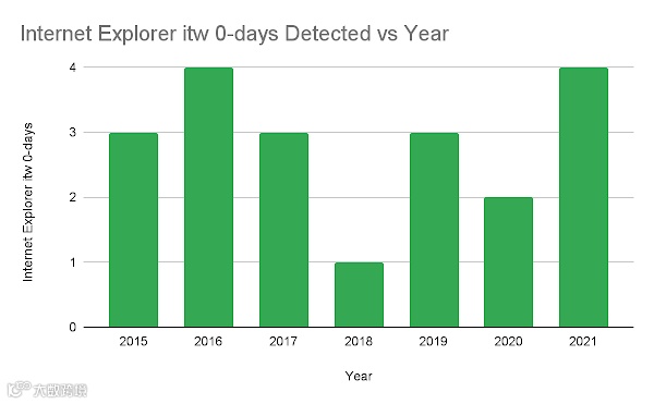 IE 浏览器中的在野0day数量稳定。虽然IE浏览器的市场份额在下降,但2021年检测和披露的0day数量和2016年持平。