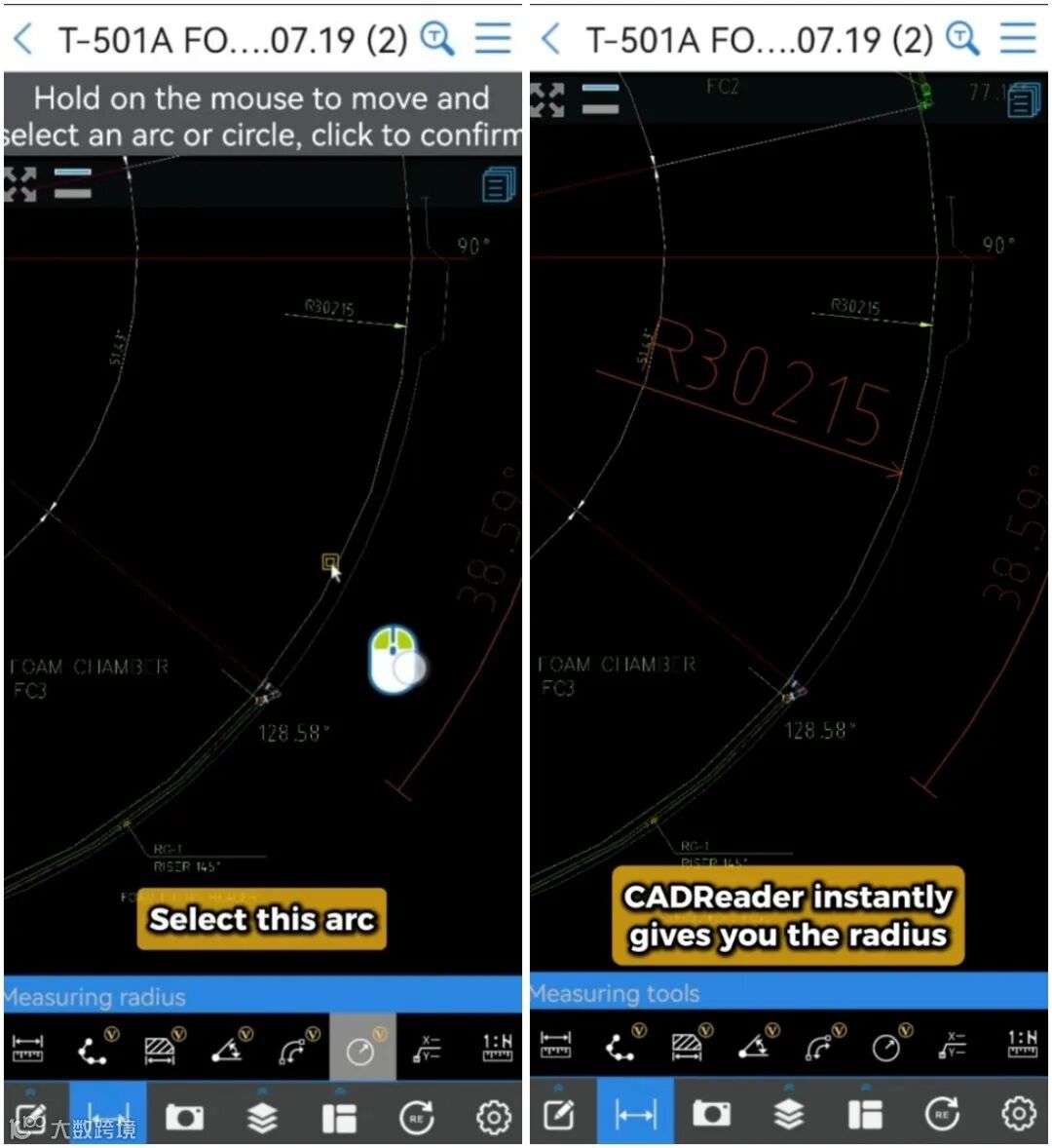 手机版CADReader打开图纸,点左下角测量,半径功能,选中弧线就能立即测出半径数据
