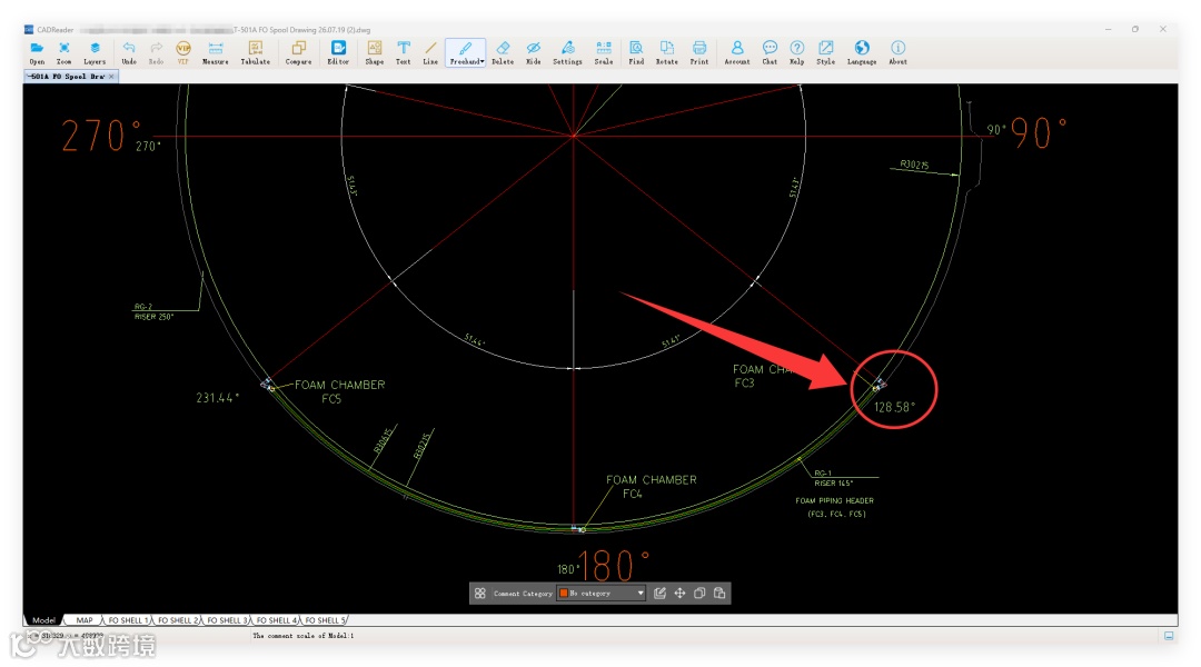 因此他们会用CADReader(CAD快速看图的国际版)的角度功能,在CAD图纸上快速、准确地测量出最近的90°基准线到这个弯头的角度