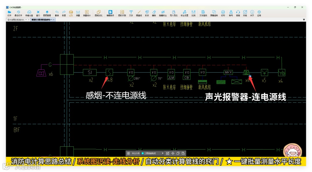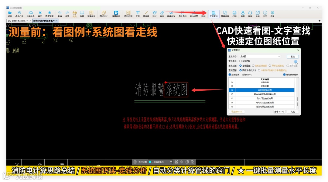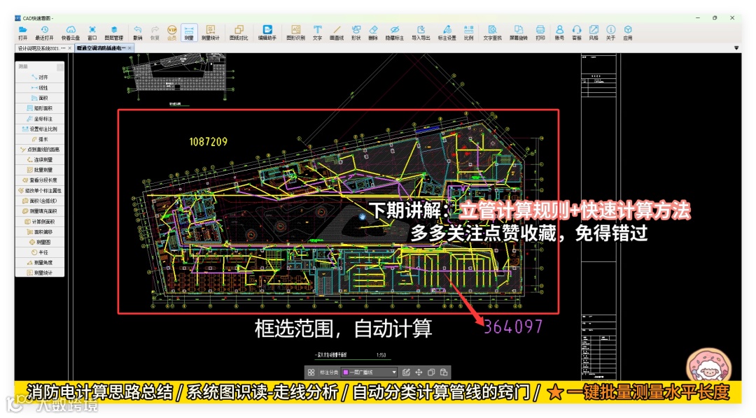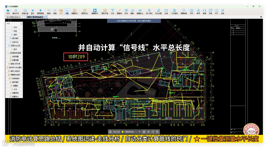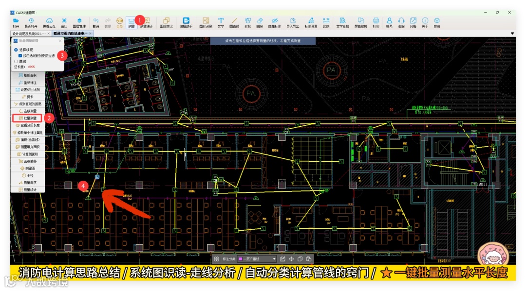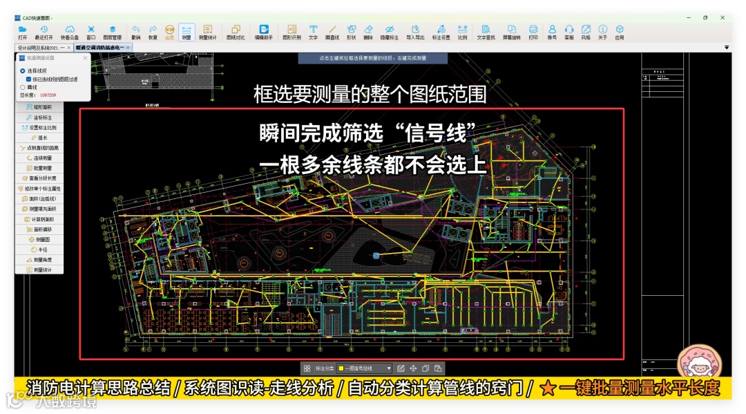 导读:消防电图纸怎么快速计算?首先明确计算思路和看图顺序,然后用CAD快速看图的【批量测量】功能,让你轻松一框,就能得到管线总长度~