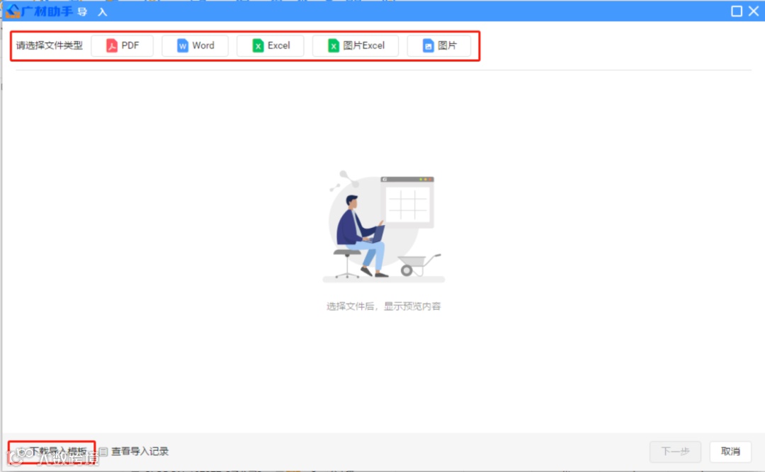 ②表格导入:下载模板调整表头字段(如材料名称、规格、价格、供应商等),一键导入材料价格。