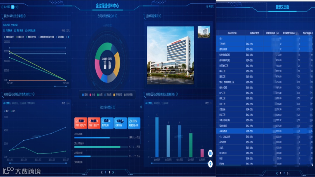 ② 依照业主视角建立甲方项目驾驶舱,更快掌握项目实时情况。(应用功能:动态成本情况、合同变动费用分析、进度跟踪情况、变更/签证/其他费用统计、原因及数量分析、累计中期付款示意图等)。