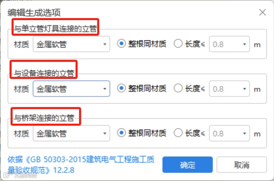 3、默认连接单立管灯具的立管、与设备连接的立管、与桥架连接的立管,整根都自动为金属软管。
