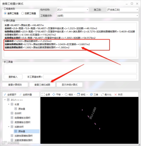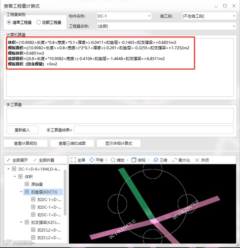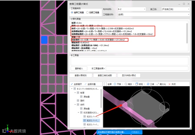 长度、总体积、侧面模板总面积、底面模板总面积、以及顶面模板总面积(受计算设置控制),加腋体积、加腋侧面模板面积、加腋底面模板面积、加腋顶面模板面积(受计算设置控制);