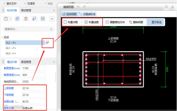 矩形梁:在属性中输入尺寸后,钢筋可以自由绘制,先布置纵筋,再布置箍筋,纵筋和箍筋都可灵活照着图纸布置;