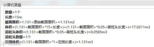 工程量含:长度、数量、截面面积、凿桩头体积、凿桩头个数,空搅体积。