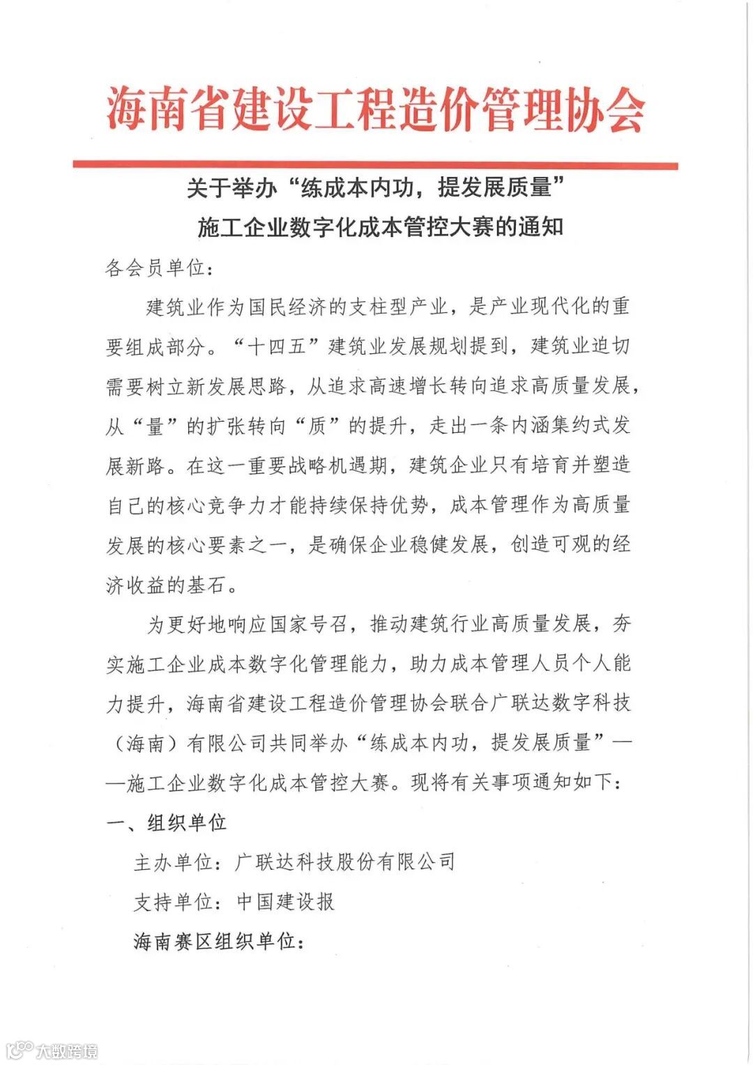 “施工企业数字化成本管控大赛”正式发布
