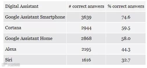 整个测试中,尽管没有一个语音智能助理表现得百分百令人满意,但谷歌智能手机版 Google Assistant 回答问题正确率高达 74.6%,所有中表现最好。微软 Cortana 和谷歌为 Google Home 设计的 Google Assistant 紧随其后,正确率分别达到 59.5% 和 58%。亚马逊的 Alexa 落后一些,也有 44.3% 的正确率。