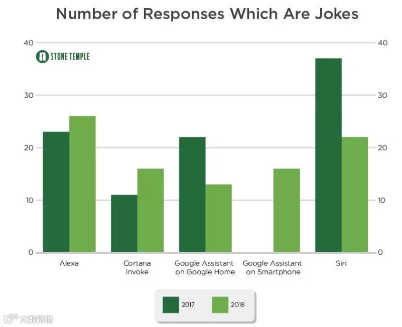 说实话,将近七年过去了,Siri 的表现如此之差真令人感到尴尬,因为在 Stone Temple 的测试报告中,Siri 只有“讲笑话”的能力是最强的。在所有关于讲笑话的问题中,2017 年 Siri 是最能讲笑话的,即便到了 2018 年也依旧不逊色(如下图)。然而,相信用户需要不是只会讲笑话的语音智能助理。
