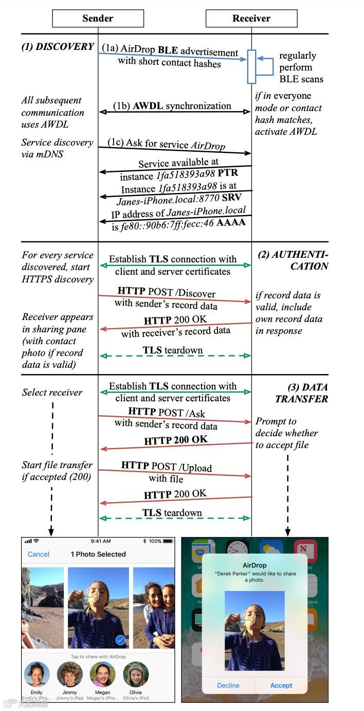 目前「接力」「隔空投送」等功能依靠的是 iCloud、蓝牙、Wi-Fi 技术进行配对和通信。以「隔空投送」为例,在设备中点击隔空投送之后,会存储一个 2048 位 RSA 身份标识,同时设备还会根据与用户 Apple ID 相关联的电子邮件地址和电话号码, 创建一个「隔空投送」身份标识哈希值。当用户选择使用 「隔空投送」 共享项目时, 设备会通过低功耗蓝牙(Bluetooth LE)发出「隔空投送」信号。附近处于唤醒状态且启用了「隔空投送」的其他设备检测到这一信号后, 会使用其所有者的身份标识哈希值的精简版本进行响应。