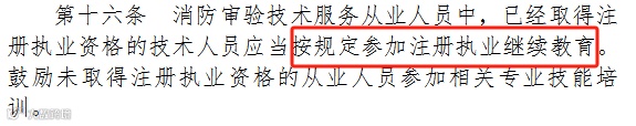第十六条 消防审验技术服务从业人员中,已经取得注册执业资格的技术人员应当按规定参加注册执业继续教育。鼓励未取得注册执业资格的从业人员参加相关专业技能培训。