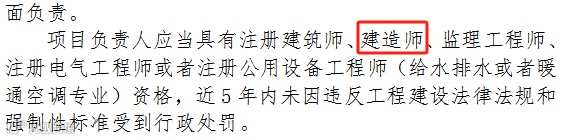 项目负责人应当具有注册建筑师、建造师、监理工程师、注册电气工程师或者注册公用设备工程师(给水排水或者暖通空调专业)资格,近5年内未因违反工程建设法律法规和强制性标准受到行政处罚。