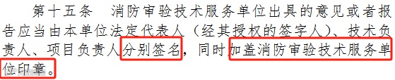 第十五条 消防审验技术服务单位出具的意见或者报告应当由本单位法定代表人(经其授权的签字人)、技术负责人、项目负责人分别签名,同时加盖消防审验技术服务单位印章。
