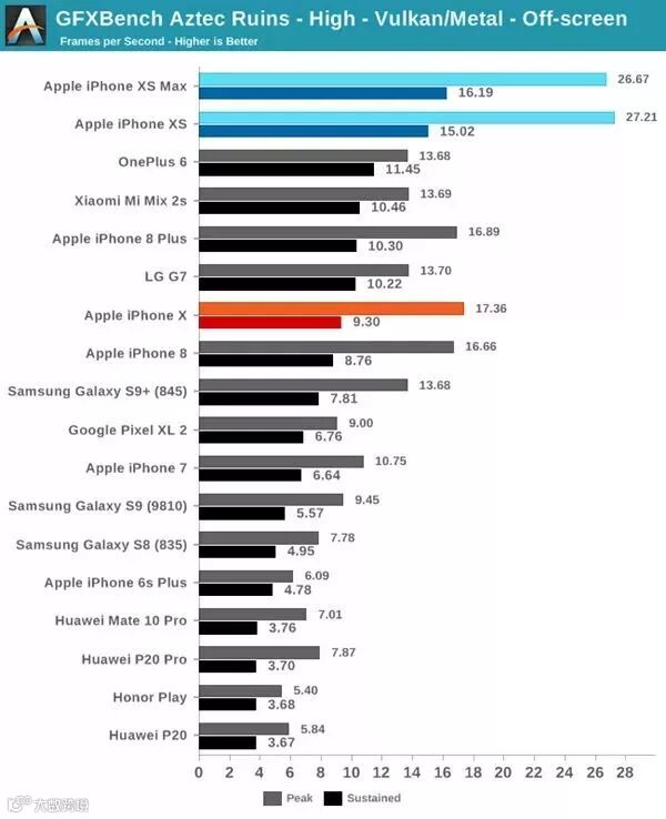 通过 iPhone XS 和 XR 实际应用和测试,苹果 A12 在性能方面处于领先地位,采用骁龙 845 的三星 Galaxy S9 和采用 Adreno 640 GPU 的 Pixel 3 都被搭载 A12 新款 iPhone 完全甩在身后。