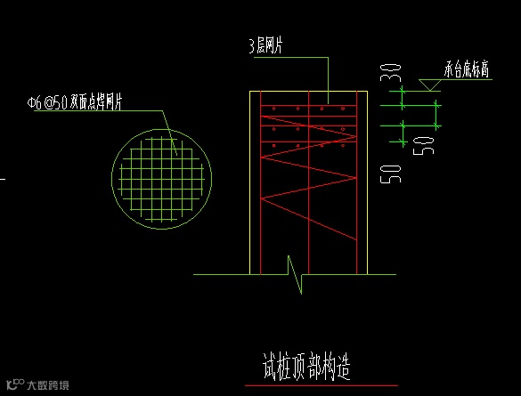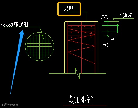 下图为试桩桩顶部构造,比常规工程桩多了3层网片,Ø6@50双面点焊网片。