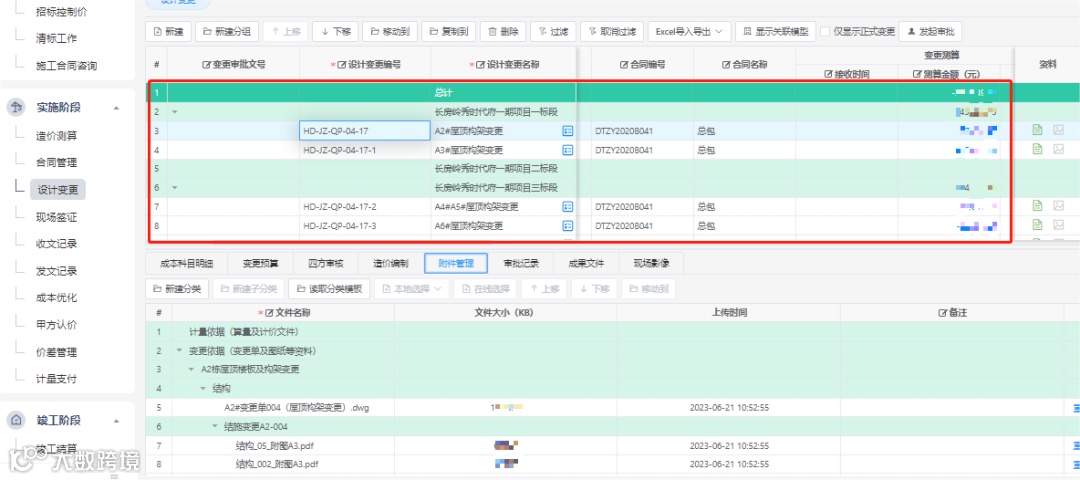 建立项目中合同管理、变更签证、计量支付、认价索赔等台账数据,并实现上下端数据自动关联,提高工作效率。