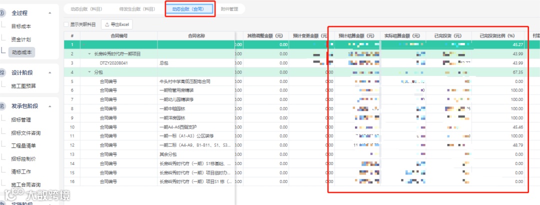 以合同维度来作为内部管控,通过动态成本的合同台账,可明确每一个分包的合同执行情况和支付情况,实时掌握工程实际造价成本数据,提前设置预警机制和采取应对措施,有效降低项目成本及超支风险。