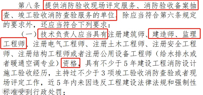 1、提供消防验收现场评定服务、消防验收备案抽查、竣工验收消防查验服务的单位,技术负责人应当具有注册建筑师、建造师、监理工程师、注册电气工程师、注册土木工程师、注册安全工程师、注册结构工程师或者注册公用设备工程师(给水排水或者暖通空调专业)资格。